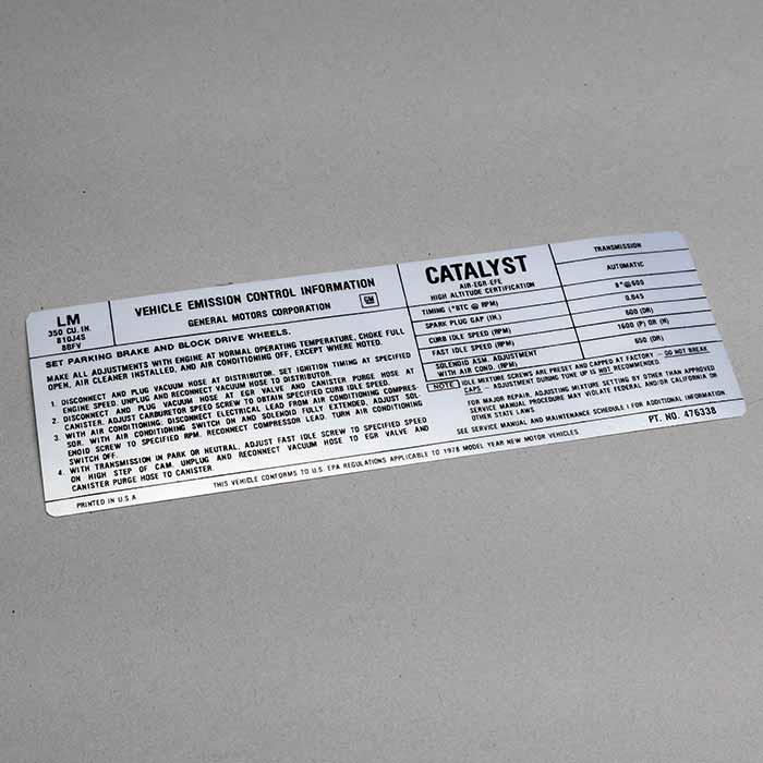 1978 350 V8 emissions decal. The part number on the corner of the decal is 476338 AT.