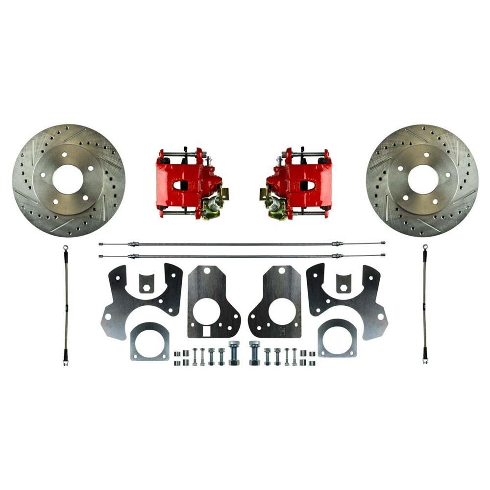 This 1978-1988 Monte Carlo, El Camino, & Malibu rear disc brake conversion kit by Right Stuff includes drilled & slotted rotors, calipers, pads, stainless hoses, e-brake cables, and hardware. Works on 15"+ wheels