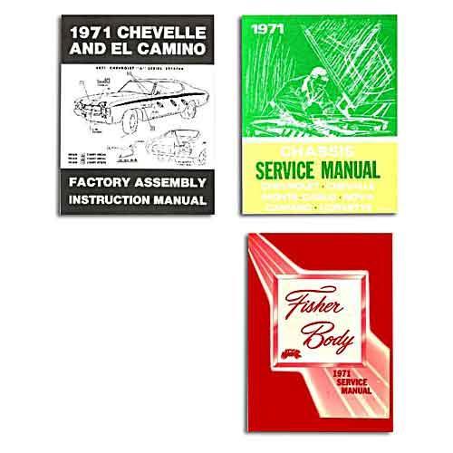 1971 Chevelle, Monte Carlo & El Camino factory shop manuals (set of 3). Included in the set are the Chassis Service Manual, the Factory Assembly Manual and the Body by Fisher Service Manual.