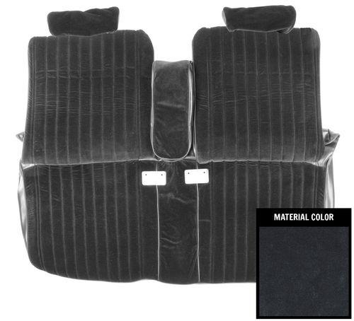 1986-1988 Monte Carlo (will fit 78-88, not for CL) medium dark blue cloth & blue vinyl premium PUI brand 50/50 front solid bottom bench and rear seat upholstery set (with one armrest). The cloth is a smooth velour and the color is very close to the dark ocean blue found in 86-88 cars. Upholstery has vertical lines or pleats, and includes armrest and headrest covers.