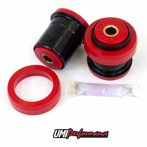 UMI’s high durometer polyurethane bushings replace the factory rubber rear end housing bushings. After many years of weather and abuse the factory rubber bushings tend to dry rot, crack and harden which can lead to decreased ride quality and performance. The UMI polyurethane bushings replace the two upper control arm rear end differential bushings – the bushings that stay attached to the rear end “ears”. New rear end housing bushings are an excellent upgrade for your street driven or track used vehicle. Kit includes two bushings and two washers, the included polyurethane washers prevent the bushings from walking side to side. Made in the USA.