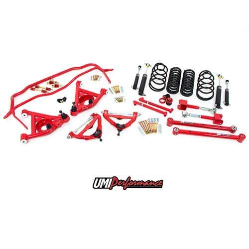 UMI’s Stage 3 kit is designed to achieve great street manners combined with Pro-Touring handling capability. Simply click and enjoy the performance. Up front you’ll find Delrin lower a-arm bushings for precise steering along with ½” taller upper ball joints to plant that tires contact patch. Out back they include their popular Roto-Joints and an adjustable length upper control arm so the axle can articulate nicely after you’ve perfected the driveline angle. Sway bars are UMI’s tried and true 1-1/4” front and 1” rear for a great front to rear handling balance. UMI’s new monotube gas shocks help to control the new premium lowering springs. The Stage 3 kit is available in red or black powder coat. 100% designed, tested, raced, and made in the USA.