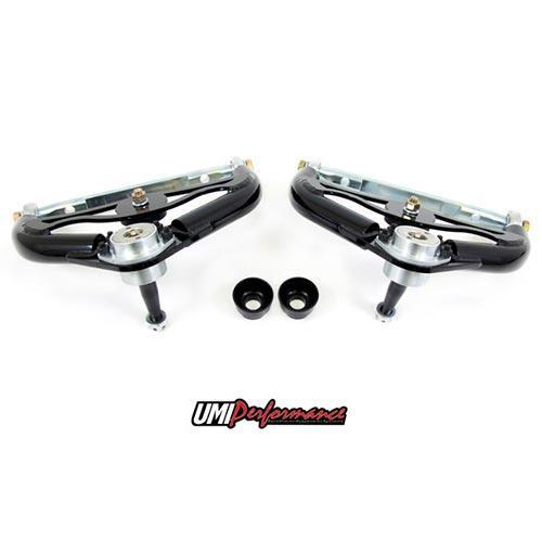 Adjustable tubular upper control arms (pair) by UMI are designed to excel in all forms of racing. The race quality rod ends provide shim-free camber and caster adjustment along with ultimate smooth travel. This arm features a relocated ball joint pad to increase caster and improve stability and steering feel as well as a shortened cross shaft to ball joint distance.