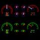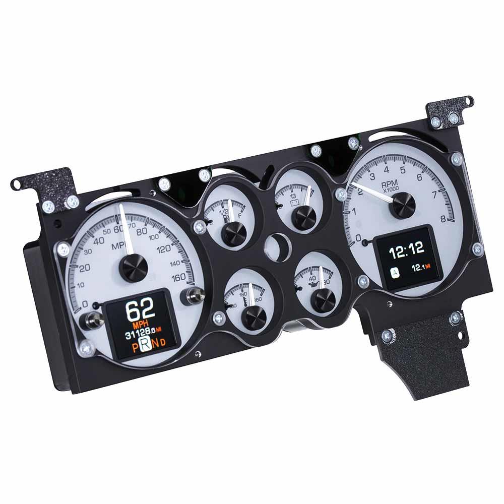 1978-1988 Monte Carlo, El Camino, & Malibu Dakota Digital HDX gauge cluster. Available with a silver or black alloy face, each HDX system allows the user to select independent illumination colors for the gauge readings and needles, as well as the message centers. Calibration and personal settings are manipulated with the built-in, capacitive-touch buttons, or the available Bluetooth app for Apple and Android devices. Each needle hub is black nickel plated spun-aluminum to match the buttons. All HDX instrument systems feature dead-faced indicators (turn signals, high beam, check engine, cruise control, parking brake, plus two user-definable), and a red, settable warning light for each gauge. With our central control box, installation is greatly simplified with vehicle-harness sourced signals and supplied, solid state sending units connecting cleanly to their respective terminal.
