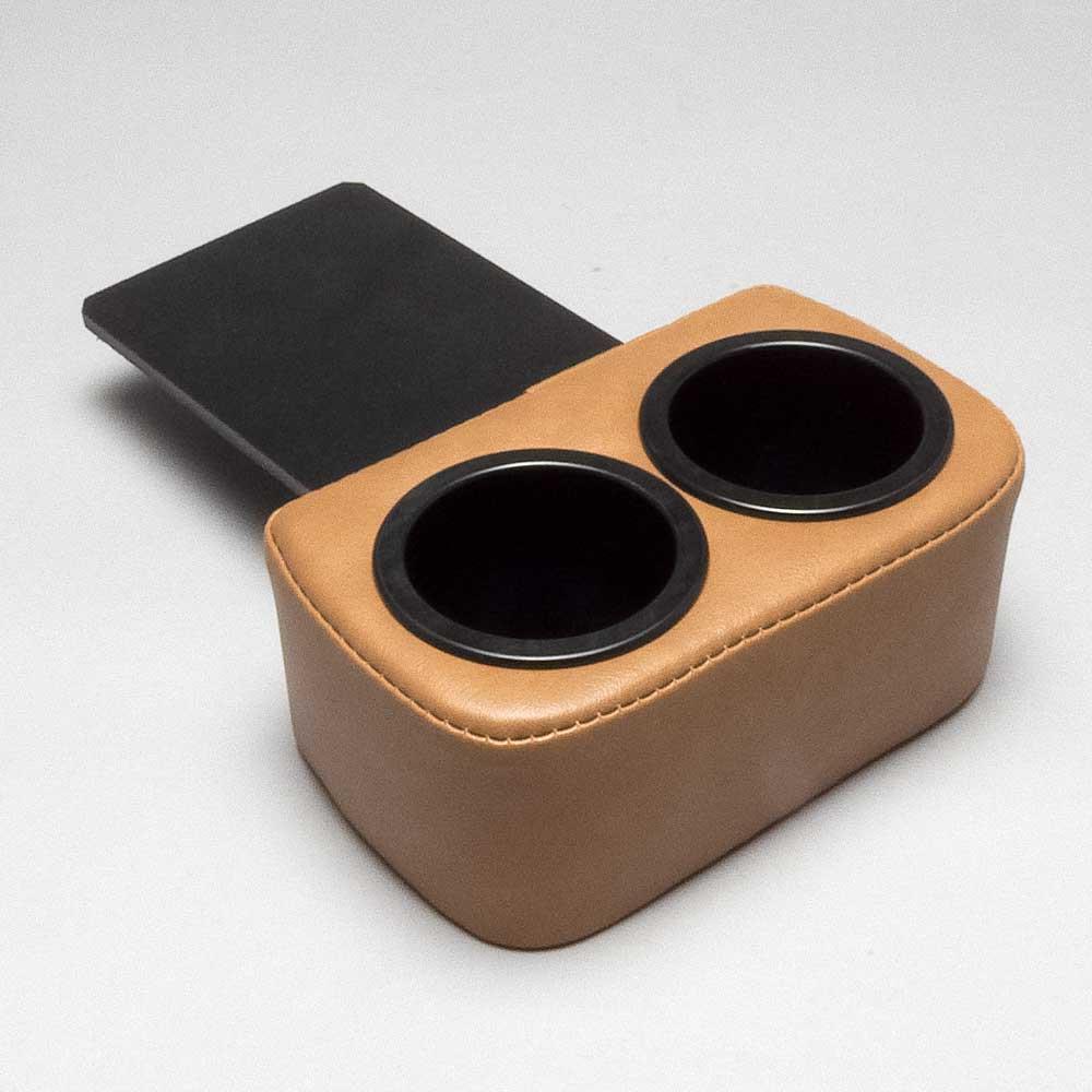 This 1980-1988 Monte Carlo, Malibu, & El Camino light saddle tan dashboard plug & chug drink holder holds two standard drinks (2-3/4" diameter) and fits into the dashboard ashtray tracks. It is made of automotive grade madrid grain vinyl and plastic (does not fit the 78-85 console with the ashtray housing and flip up door).