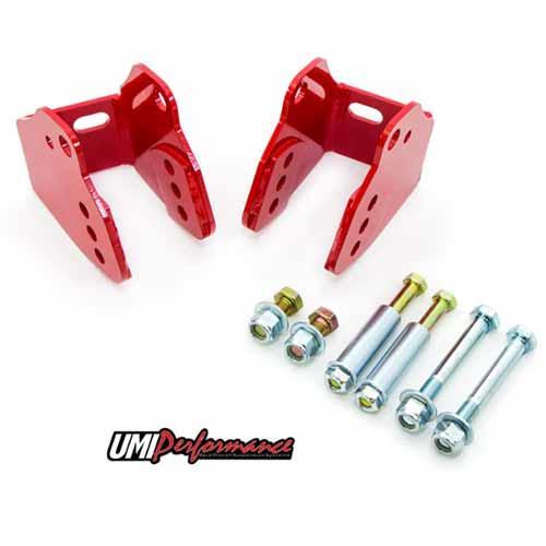 Wheel hop or traction issues? UMI has the solution! Optimize your vehicle's instant center and improve forward traction by lowering the rear of the lower control arm 2", 2-3/4", or 3-1/4". These bolt-in brackets are CAD designed to accommodate factory lower control arms as well as all popular aftermarket styles. Robust flanges inside the brackets add reinforcement and ensure factory bushings bolt right in. Brackets installed can provide an average 0.10 second (or better) 60-foot reduction and an overall improvement in launch consistency. Brackets are constructed of 3/16" mild steel and CNC laser cut for precision tolerances. Relocation brackets are designed to work on both lowered and non-lowered vehicles and feature multiple settings to optimize vehicle handling and traction. Welding recommended on cars running drag radials or slicks and faster than 11 second ¼ mile time. Hardware included. Made in the USA.