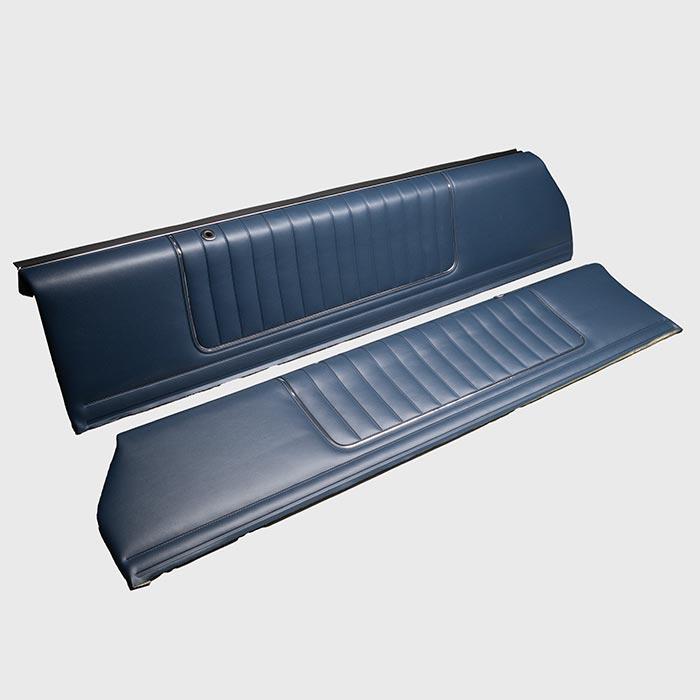 1982-1985 Monte Carlo medium blue vinyl upper door panel set with the correct chrome mylar accent (pair, PUI brand).