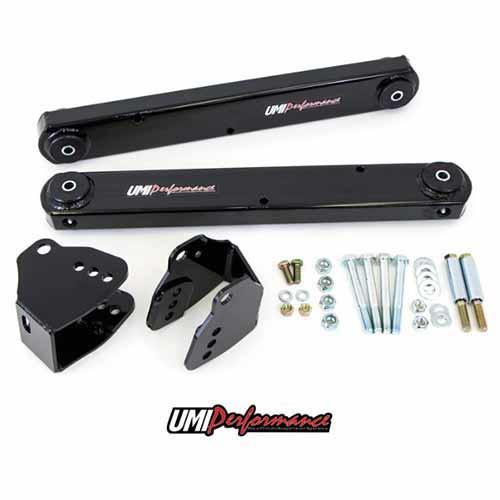 Wheel hop or traction issues? UMI has the solution! Optimize your vehicle's instant center and improve forward traction by lowering the rear of the lower control arm. This trailing arm and bracket system relocates the rear lower arm pickup point for improved drag launch capability. The boxed trailing arm features offset sway bar holes to allow for a level factory bar even at the lowered position. The jig-built bolt-on brackets fit factory 7.5 and GN 8.5 rear axle housings and provide 3 position instant center adjustment. Welding is recommended when used with drag radials or slicks. Adjustable upper control arms are not required but recommended. Available in black and red powder coat. Hardware included. Made in the USA.