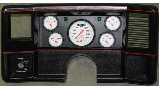 This 1982-1988 Monte Carlo, El Camino, & Malibu 1st design 5-gauge shadow box includes Classic Instruments white face gauges, 86-88 style faceplate, wiring, and lights (will fit in 82-85 cars with new headlight switch knob and bracket). Fits into your existing gauge pod (modification required to existing box). Some wiring required with wiring harness and instructions supplied (some common wiring tools are required). Gauges included: 160mph speedometer w/ built-in tachometer, odometer, 240ohm fuel level gauge, oil pressure, water temperature, voltmeter. Oil pressure and temperature senders included. (2) green LED turn signals installed, blue LED bright beam indicator and red LED brake indicator included. You will need to reuse your right indicator lens, A/C duct & vent, light switch and knob. Must have the round gauge layout to work (rectangular speedo from 78-80 Malibu & El Camino will not work). Please contact us to state your choice of original interior colors.